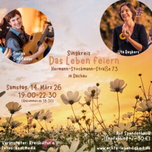 Zu Beginn der zweiten Jahreshälfte bringen uns diesmal Uta Reykers und Sebastian Kottmair Mantren, bekannte Kreislieder und eigene Kompositionen mit. Das wird ein Fest, mit viel Freude und Verbundenheit im Miteinander und Euren singenden und klingenden Stimmen und Herzen.